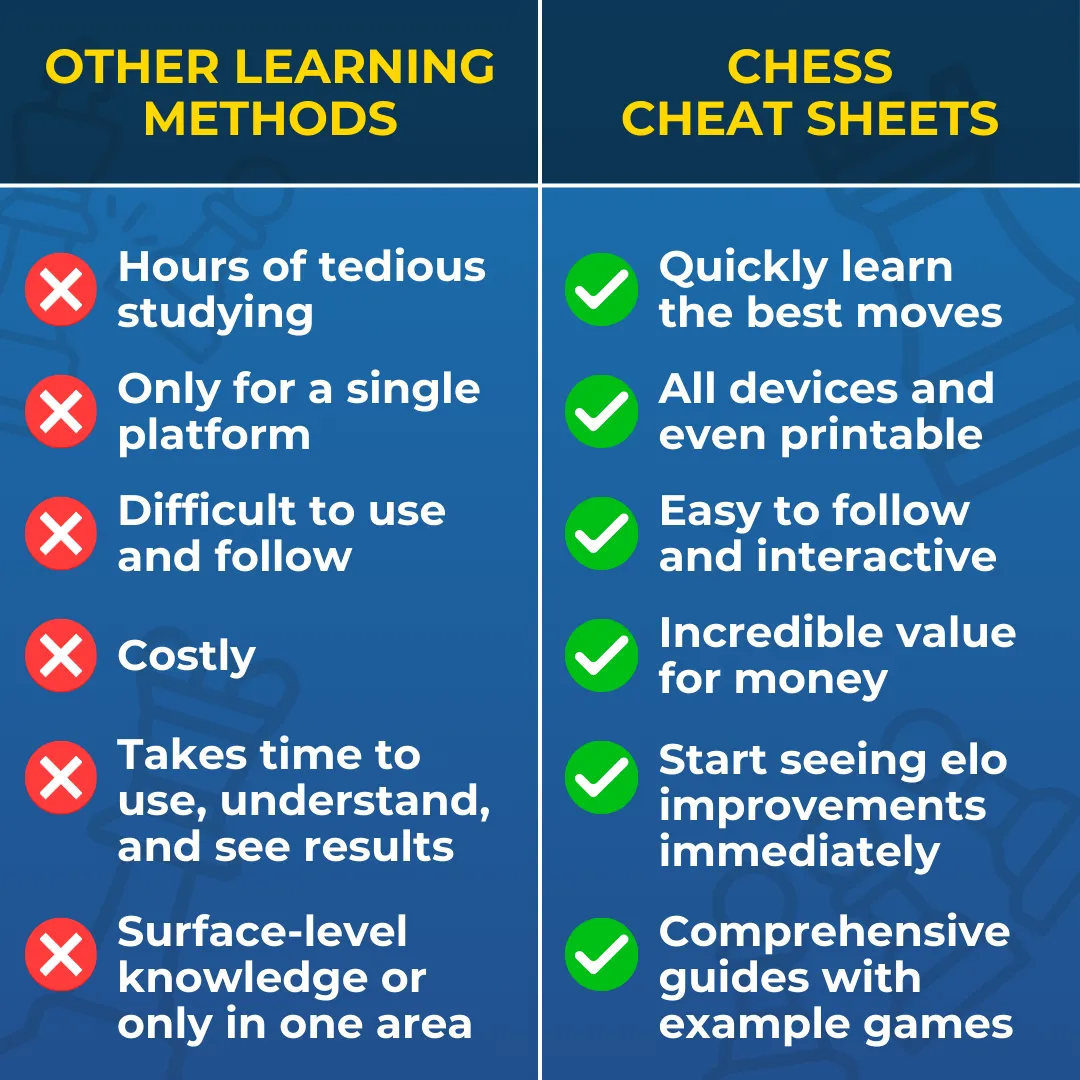 “I spent years studying openings through books and videos with minimal improvement. These cheat sheets simplified everything. My rating jumped 300 points in just one month!” – Michael T.